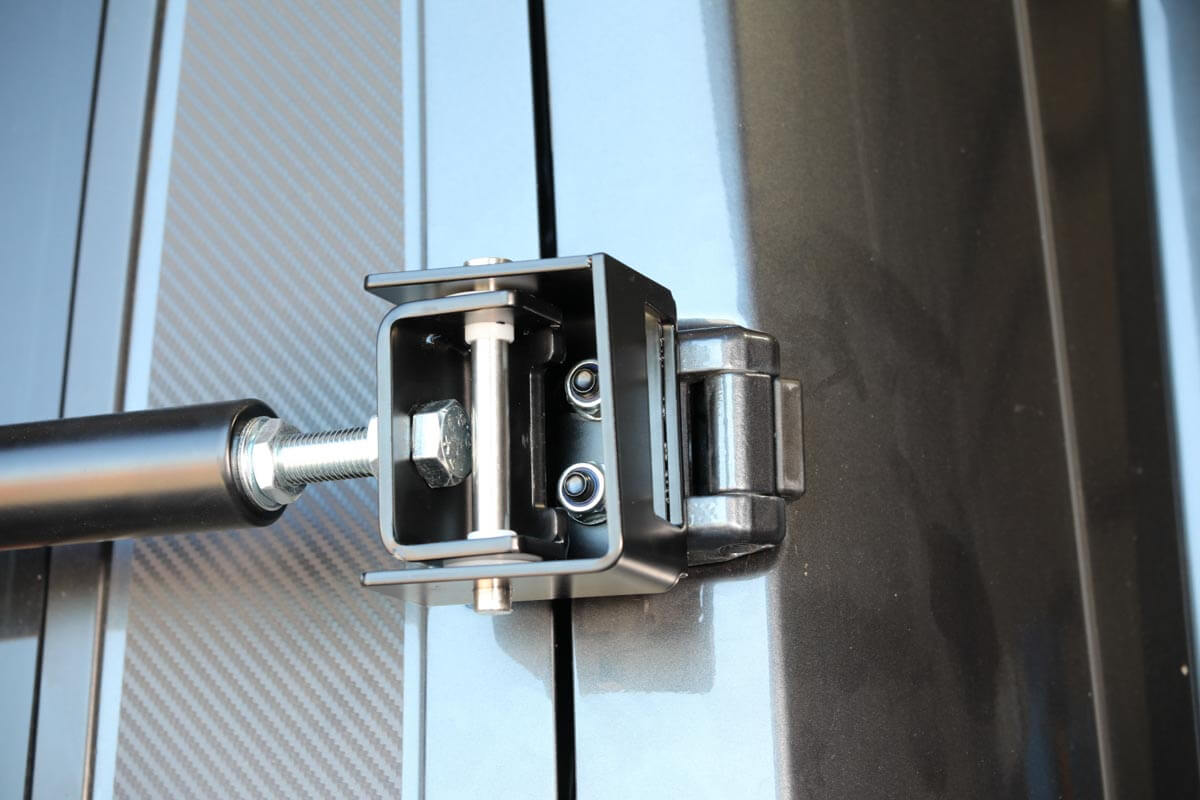 Il existe également un système conçu pour être directement fixé sur les charnières des portes arrière du véhicule. Ce type de fixation est idéal pour les fourgons et les vans aménagés. Le principal avantage de ce système réside dans son absence de modification de la carrosserie. Il n’est en effet pas nécessaire de percer la carrosserie ou de modifier la structure du véhicule pour l’installer.