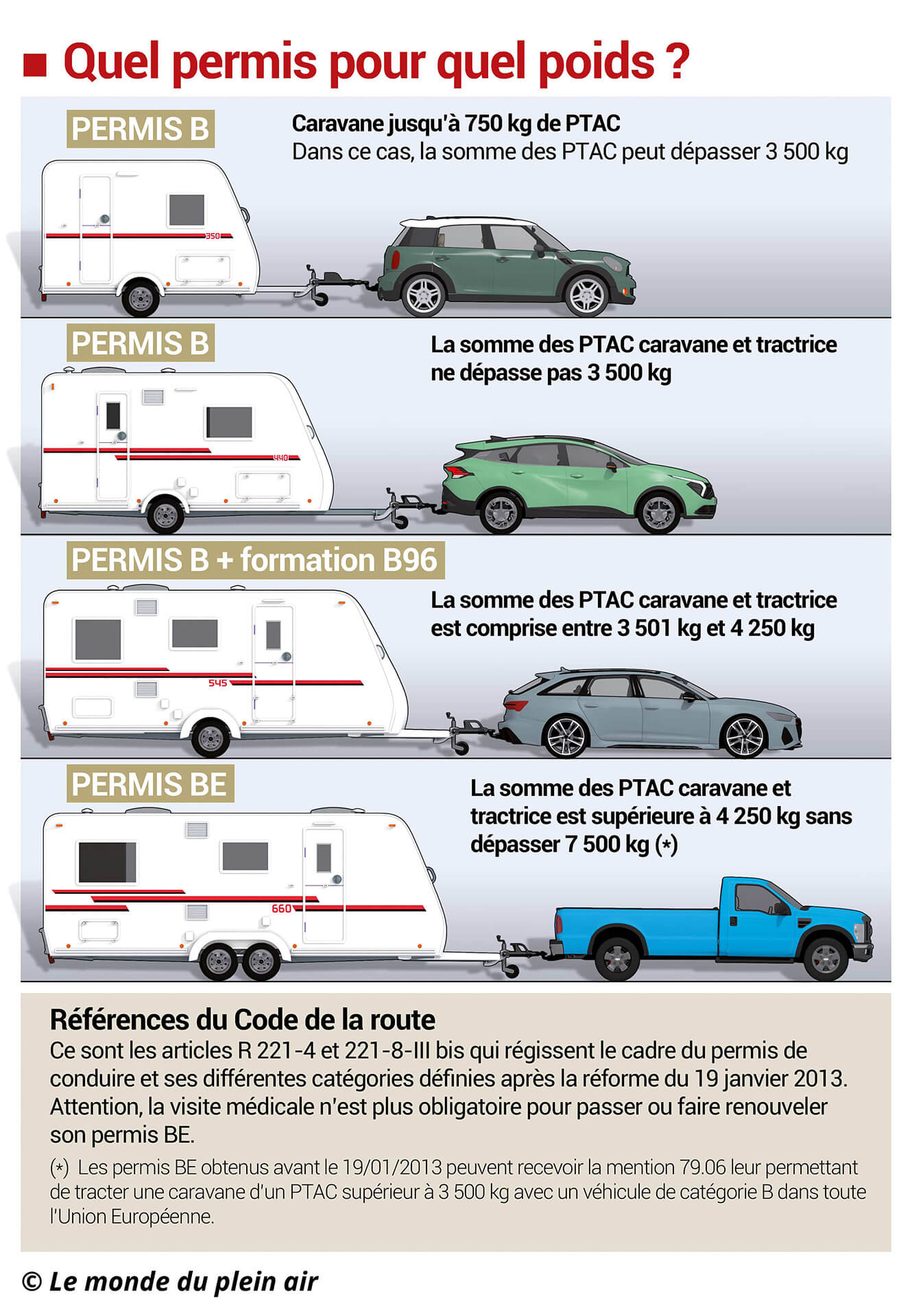 Si le PTAC de votre remorque est supérieur à 750 kg, ou bien si le PTAC de votre camping-car avec la remorque tractée dépasse 4 250 kg, vous devrez détenir le permis BE.